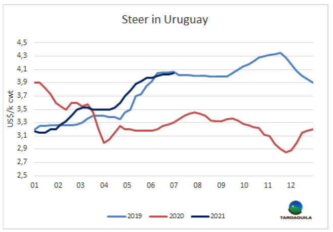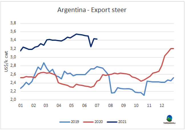本周出口閹牛價(jià)格較上周大體保持不變。最好的英國(guó)純種閹牛參考價(jià)320-330比索/公斤。印度串種閹牛300-315比索/公斤。特優(yōu)母牛參考價(jià)255-260比索/公斤,發(fā)往中國(guó)市場(chǎng)的工業(yè)母牛價(jià)格在出口關(guān)停后大幅下跌,目前的參考價(jià)在195-215比索/公斤。