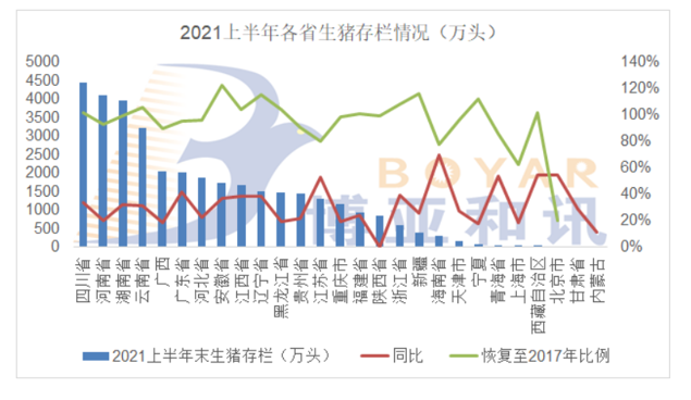 7月,生豬存欄2.97億頭,環(huán)比增加3.7%,同比增加31.89%。能繁母豬存欄3448萬頭,環(huán)比減少0.17%,同比減少1.02%。母豬存欄有所下降,低效母豬淘汰增加,三元母豬占比降至4成以內(nèi)。根據(jù)各省生豬存欄數(shù)據(jù),四川存欄量4451.7萬頭;河南存欄4101.12萬頭;湖南存欄3952.1萬頭。各省生豬存欄與2017年相比,除了北京、上海、青海、海南、江蘇、廣西外,其他省份已經(jīng)恢復(fù)至2017年的90%以上。四川、云南、安徽、江西、遼寧、黑龍江、福建、浙江、新疆、寧夏、西藏11省已經(jīng)超過2017年存欄量。