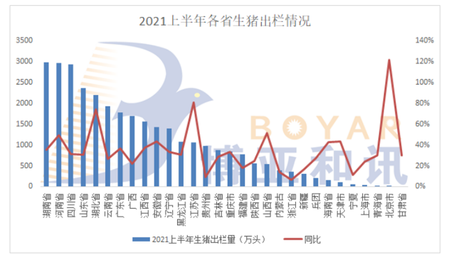 根據(jù)各省統(tǒng)計(jì)局公布的生豬出欄數(shù)據(jù),排名前三省份上半年出欄量均在2900萬頭以上。其中,湖南出欄量2980.3萬頭,同比增長35.2%。河南出欄量2966.53萬頭,同比增長49.8%。四川出欄量2928.7萬頭,同比增加31.4%。上半年,全國生豬出欄3.3億頭,同比增長34.4%。