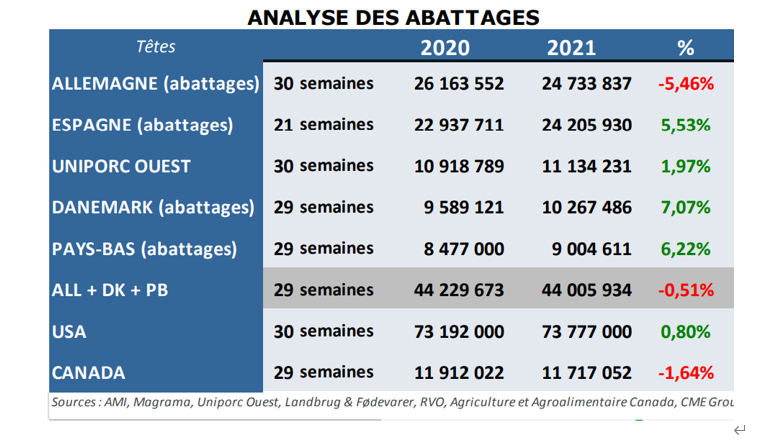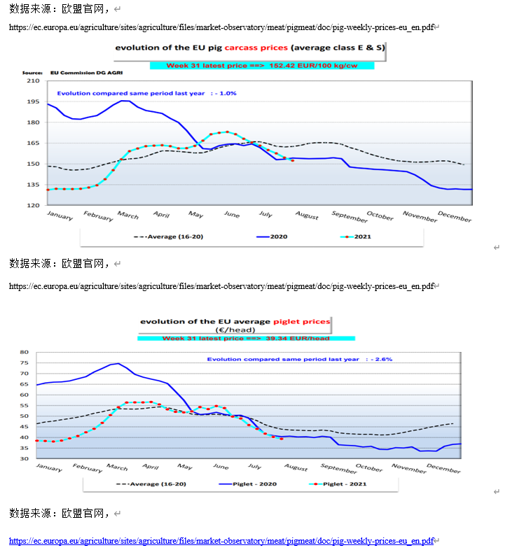 2021年歐盟7月豬胴體均價(jià)1.52歐元/kg,環(huán)比下滑6.23%,同比下滑0.46%。7月歐洲本地消費(fèi)恢復(fù)緩慢。另外,中國豬肉進(jìn)口需求疲軟,豬價(jià)承壓下行。丹麥豬胴體價(jià)格1.58歐元/kg,環(huán)比下跌8%,同比下跌5.5%。德國豬胴體價(jià)格1.49歐元/kg,環(huán)比下跌5%,同比下滑13%。西班牙豬胴體價(jià)格1.69歐元/kg,環(huán)比下跌9.9%,同比上漲7.3%。