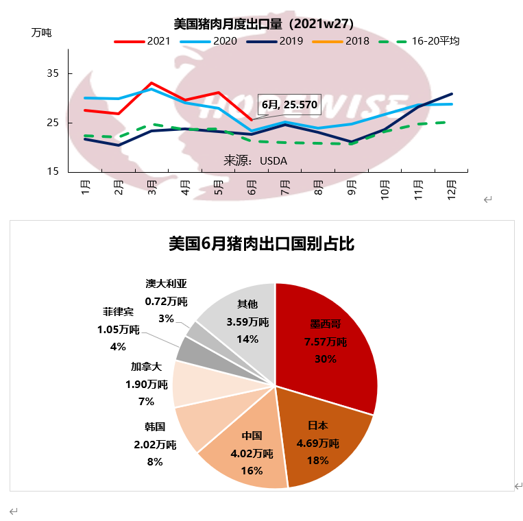 美國6月豬肉出口25.57萬噸,環(huán)比減少18%,同比增加9%。其中,出口墨西哥7.57萬噸,環(huán)比增加1%,同比增加52%,占6月美國豬肉出口總量的52%。出口中國4.02萬噸,環(huán)比減少45%,同比減少48%,占比16%。出口日本4.69萬噸,環(huán)比減少9%,同比增加38%,占比18%。強(qiáng)勁的墨西哥進(jìn)口需求不足以抵消中國進(jìn)口的下降。日本進(jìn)口量超過中國,躋身第二大美國豬肉出口目的國。出口韓國2.02萬噸,環(huán)比減少21%,同比增加31%,占比8%。