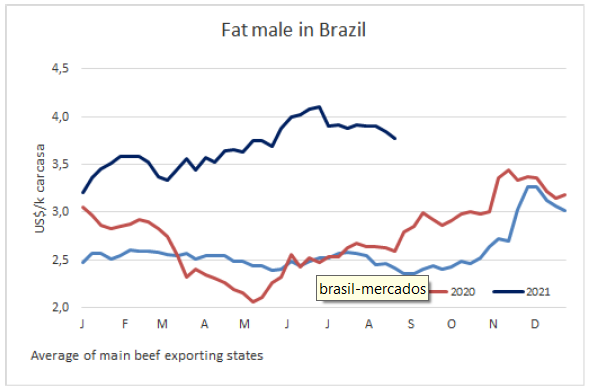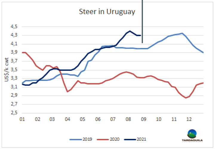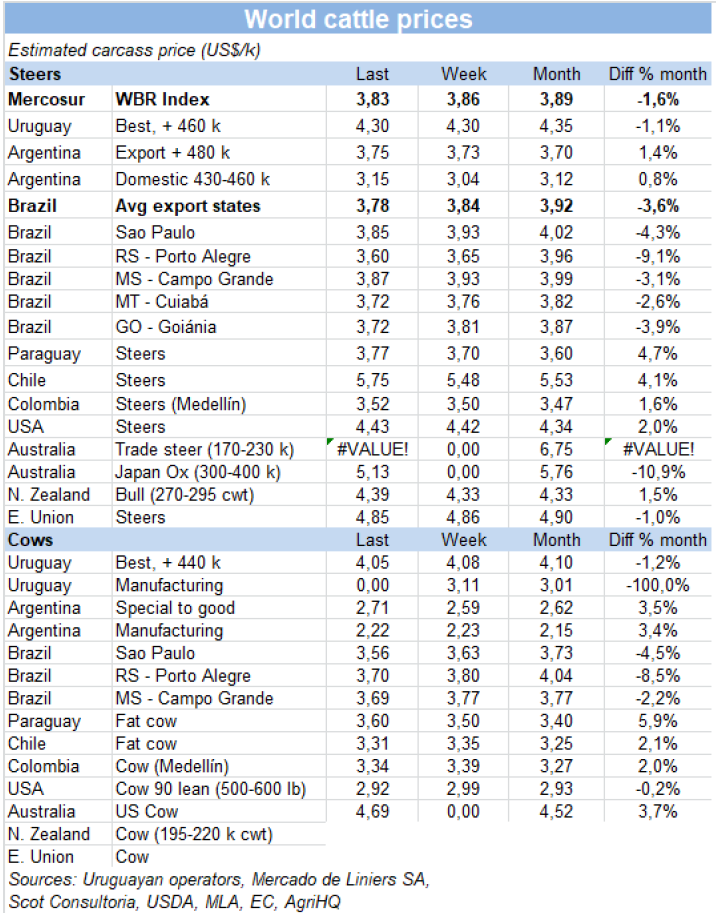 育肥牛市場保持下行趨勢,或?qū)⒊掷m(xù)數(shù)周。據(jù)被問詢的市場參與者反映,大多數(shù)工廠備貨充足,期貨采購時(shí)間拉長,有些工廠甚至開始買九月前10天的牛。這種情況下工廠壓價(jià)幾美分,只要生產(chǎn)者可以接受,價(jià)格會繼續(xù)下跌。本周用于出口的特種閹牛參考價(jià)4.3美元/公斤,國內(nèi)市場的閹牛參考價(jià)4.25美元/公斤,肉母牛4.05-4.15美元/公斤,牛供應(yīng)量仍很少,預(yù)計(jì)15天之后隨著天氣變化和烏拉圭南部的降雨來臨活牛供應(yīng)將增加。