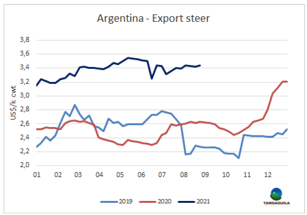據(jù)阿根廷牛肉推廣局(IPCVA)基于國家統(tǒng)計(jì)和人口普查數(shù)據(jù)的一份報(bào)告,7月阿根廷牛肉出口量36113噸(相當(dāng)于約50600胴體重量),出口額約1.95億美元,不包括內(nèi)臟。7月出口量比6月下降了0.5%(這反過來表明出口庫存比5月暴跌了45%),出口量較2020年同期低33.4%。7月出口額較6月增長了22.6%,但與2020年7月相比同比下降15.2%。7月平均出口價(jià)格較上月上漲18%,較2020年7月上漲27.4%。上一個(gè)移動年阿根廷牛肉出口量達(dá)89萬噸。IPCVA表示,在上一個(gè)移動年(2020年8月至2021年7月),出口量接近89萬噸,出口額接近26.6億美元。僅在2021年前7個(gè)月,阿根廷牛肉出口量達(dá)到了334341噸,比去年同期增長近2%,其中76.6%出口到中國。今年前7個(gè)月阿根廷隊(duì)中國牛肉出口量增長了185%,而其他國家的牛肉出口量累計(jì)萎縮了85%。