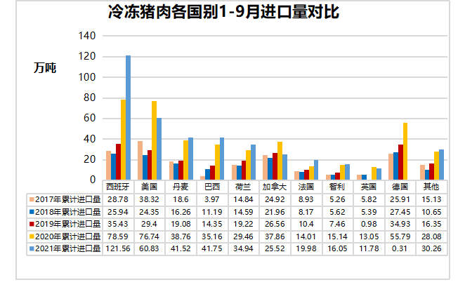 9月,中國(guó)主港豬肉進(jìn)口量30.86萬(wàn)噸,環(huán)比減少19%,同比減少34%。1-9月,中國(guó)主港豬肉進(jìn)口量404.50萬(wàn)噸,同比減少4%。進(jìn)口國(guó)別方面,西班牙仍是中國(guó)豬肉進(jìn)口第一大國(guó),累計(jì)出口中國(guó)121.56萬(wàn)噸,占中國(guó)豬肉進(jìn)口總量的30%。其次是美國(guó)、巴西、丹麥、荷蘭、加拿大、法國(guó)、智利、英國(guó)、愛(ài)爾蘭、墨西哥和奧地利。值得關(guān)注的是,巴西豬肉累計(jì)出口中國(guó)41.75萬(wàn)噸,超過(guò)丹麥,成為中國(guó)豬肉進(jìn)口第三大國(guó)。