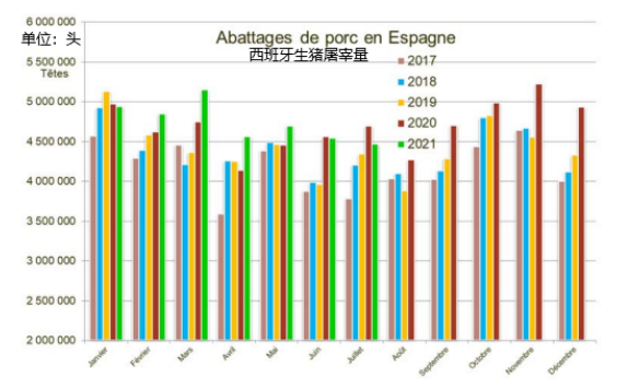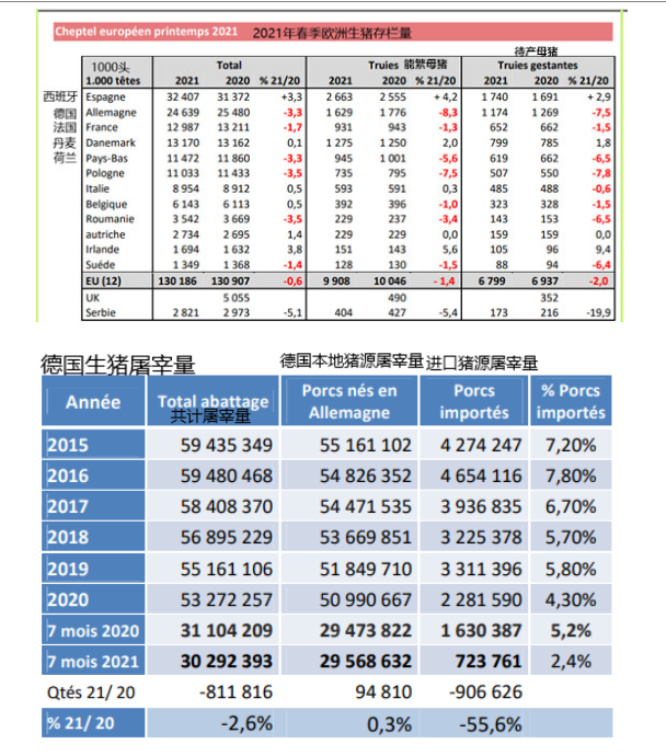 2021年第一季度,歐盟生豬存欄1.30億頭,同比減少0.6%。其中,西班牙生豬存欄3240.7萬(wàn)頭,同比增加3.3%。德國(guó)生豬存欄2463.9萬(wàn)頭,同比減少3.3%。法國(guó)生豬存欄1298.7萬(wàn)頭,同比減少1.7%。丹麥生豬存欄1317萬(wàn)頭,同比增加0.1%。荷蘭生豬存欄1147.2萬(wàn)頭,同比減少3.3%。除了西班牙和丹麥能繁母豬數(shù)量同比分別有4.2%和2%的增長(zhǎng),德國(guó)、法國(guó)、荷蘭能繁母豬存欄均有減少。屠宰量方面,德國(guó)1-7月生豬屠宰量3029.2萬(wàn)頭,同比減少2.6%。西班牙1-7月生豬屠宰量3321.1萬(wàn)頭,同比+2.71%。其中,7月屠宰446.9萬(wàn)頭,同比減少4.76%。
