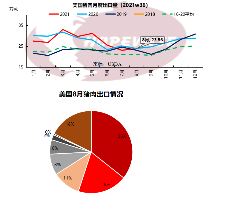 美國(guó)8月豬肉出口23.85萬(wàn)噸,環(huán)比增加3.48%,同比減少0.25%。其中,出口墨西哥8.52萬(wàn)噸,環(huán)比增加21.27%,同比增加50.41%,占8月美國(guó)豬肉出口總量的35.72%。墨西哥的后腿需求十分強(qiáng)勁。出口中國(guó)2.61萬(wàn)噸,環(huán)比減少2.04%,同比減少49.23%,占比11%。中國(guó)本地豬肉鮮品價(jià)格便宜,凍品進(jìn)口需求持續(xù)疲軟,是出口中國(guó)下降的主要原因。出口日本4.60萬(wàn)噸,環(huán)比增加3.04%,同比增加8.83%,占比19%。日本超過(guò)中國(guó),成為美國(guó)豬肉出口第二大國(guó)。出口韓國(guó)1.34萬(wàn)噸,環(huán)比減少26.13%,同比增加5.40%,占比6%。