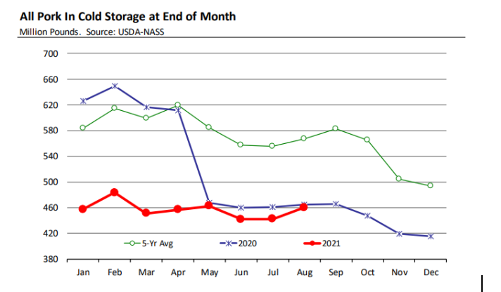 存欄方面,USDA9月1日生豬存欄數(shù)據(jù)顯示,生豬存欄7540萬(wàn)頭,環(huán)比增加1%,同比減少4%。能繁母豬存欄619萬(wàn)頭,同比減少2%,較6月統(tǒng)計(jì)的存欄減少0.6%。這是自2013年以來(lái)首次9月統(tǒng)計(jì)的能繁母豬存欄量低于6月統(tǒng)計(jì)的能繁母豬存欄量。預(yù)計(jì)明年春天和夏天會(huì)迎來(lái)能繁母豬存欄歷史低位。商品豬存欄6920萬(wàn)頭,同比減少4%。生豬存欄量同比減少比較明顯的是體重低于120磅的,這些生豬預(yù)計(jì)在今年冬季出欄,相應(yīng)的屠宰量預(yù)計(jì)同比減少6%。