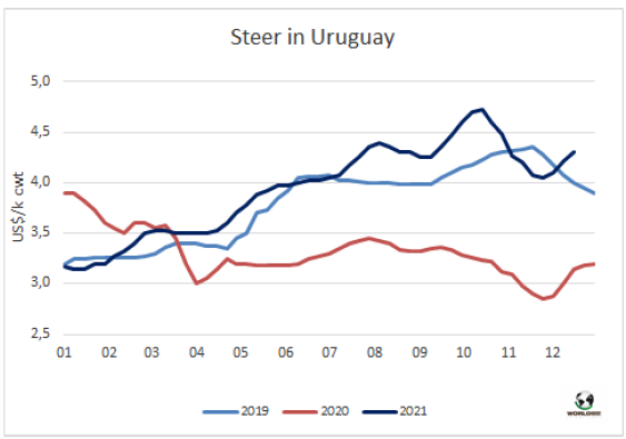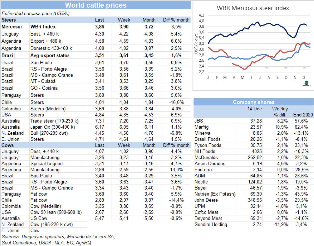 本周南方共同市場閹牛價(jià)格指數(shù)在連續(xù)五周的上漲之后下跌,本周下跌了4美分至3.86美元/公斤。該指數(shù)下跌的主要原因是巴西育肥牛雷亞爾價(jià)格下滑。此外,巴西雷亞爾兌美元匯率下跌了0.9%,巴西主要出口州育肥牛價(jià)格本周下降了10美分至3.51美元/公斤,與其他地區(qū)相比,巴西的價(jià)格拉開了與其他地區(qū)牛價(jià)的差距。相反烏拉圭市場堅(jiān)挺,特種重型閹牛貿(mào)易參考價(jià)4.3美元/公斤。阿根廷和巴拉圭市場保持穩(wěn)定,阿根廷出口閹牛參考價(jià)在4.58美元/公斤,巴拉圭參考價(jià)3.8美元/公斤。
