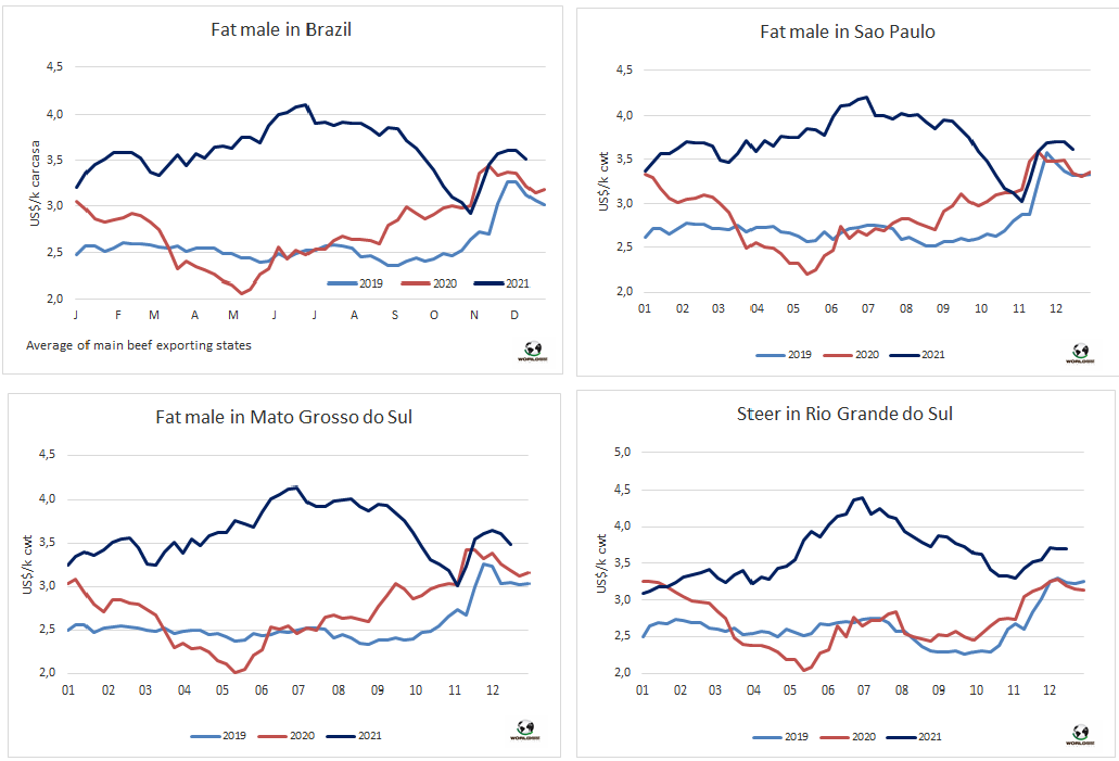 育肥牛價(jià)格本周全面下跌。主要原因是12月上半月國內(nèi)市場表現(xiàn)不佳,和無法出口中國。唯一牛價(jià)沒有下行的地區(qū)是南里奧格蘭德州,南馬托格羅索州和馬托格羅索州牛價(jià)有持續(xù)下跌,育肥牛價(jià)格較上周下跌了7-8雷亞爾/15公斤分別下跌至297.5雷亞爾/15公斤和291.5雷亞爾/15公斤。圣保羅州牛價(jià)下跌了4.5雷亞爾/15公斤,至308.5雷亞爾/15公斤。圣保羅州預(yù)定時(shí)間在8天左右,工廠的采購價(jià)格仍保持下行壓力。包裝工廠和分銷商的牛肉庫存都很大。