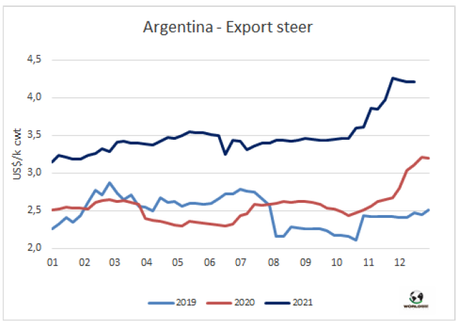 如果阿根廷政府宣布的牛肉出口政策得到確認(rèn)并全年實(shí)行,明年不含骨類的出口量將達(dá)79萬噸,預(yù)計(jì)較2021年增長11.3%,2021年全年出口量將達(dá)71萬噸。
