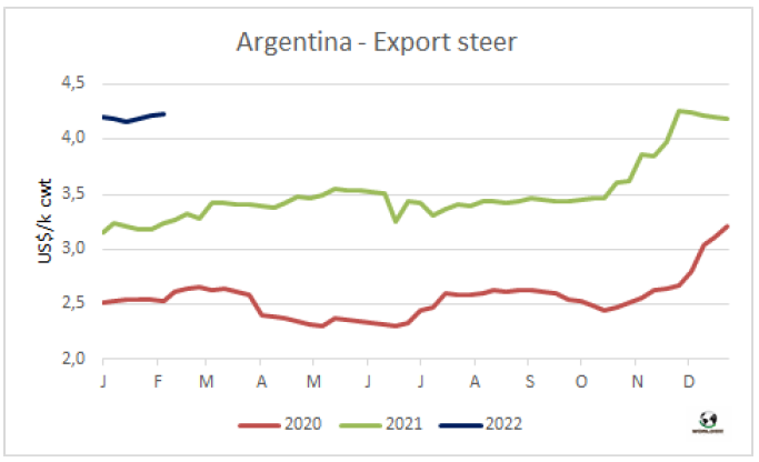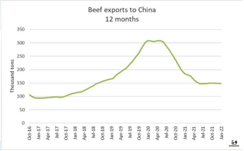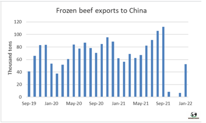 1月烏拉圭對中國的平均出口價格5931美元/噸,比12月的平均價格低43美元。烏拉圭對中國平均出口額連續(xù)11個月的增長畫上句號。2022年1月的平均價格同比增長了49%,這是由于不同部位肉價格的上漲,去骨部位肉相對于帶骨牛肉的占比更大。今年1月,烏拉圭對中國牛肉出口量占總出口量的76%,其中冷凍牛肉對中國出口量占總冷凍牛肉出口量的82%。根據(jù)海關(guān)出口數(shù)據(jù),1月烏拉圭牛肉出口量33167噸,平均價格為6455美元/噸。盡管出口量較去年12月的峰值下降了20%,但仍比2021年1月高27%。