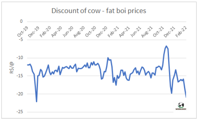 由于對中國出口的緊迫需求使可以出口到中國的30月齡以下的小公牛價格與母牛價格的價差拉大。圣保羅州可以對中國出口的小公牛采購價要高出15雷亞爾/15公斤。反過來,育肥母牛與育肥公牛之間的價格差擴(kuò)大到20雷亞爾/15公斤,這是自2019年11月以來的最大差距,當(dāng)時對中國出口也有非常強(qiáng)烈的需求。相反,當(dāng)巴西暫停對中國的出口時,母牛與公牛之間的價格差距縮小到8雷亞爾/15公斤。一周內(nèi),育肥牛價格小幅下調(diào),而批發(fā)市場后部位肉價格保持穩(wěn)定,而前部位肉價格則有所上漲。