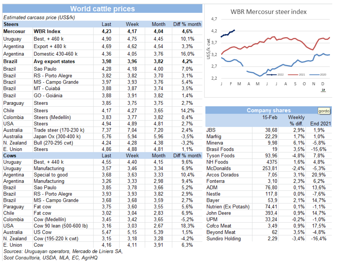 根據(jù)ABC出口商會的一份報告,去年待宰牛平均體重有所增加:母牛平均胴體重量為每頭210公斤,公牛的平均胴體重量為每頭246公斤,均高于2020年數(shù)據(jù)。對于ABC來說,由于“穆尼屠宰量減少和較輕動物數(shù)量減少”,平均體重為每頭228公斤,比2020年增長了2公斤。2022年的第一個月,這一數(shù)值再次被超越,達229公斤,盡管報告稱這 “與我們的競爭對手相比仍有很大差距”。