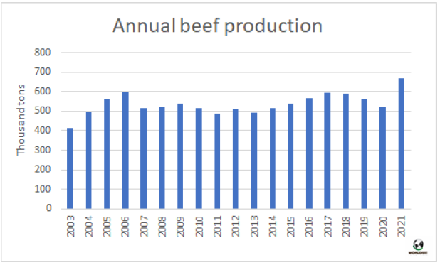 2021年創(chuàng)紀(jì)錄的牛屠宰量決定了牛肉產(chǎn)量大幅增長,達66.8萬噸,創(chuàng)歷史最高紀(jì)錄,同比增幅為28.7%。牛肉產(chǎn)量比2006年的最高紀(jì)錄高出6.9萬噸。牛屠宰量較2006年增加了不到5萬頭,增幅為1.9%,胴體重量增加了21.8公斤增幅約9.4%,因此牛肉產(chǎn)量比之前的記錄高出了11.5%。