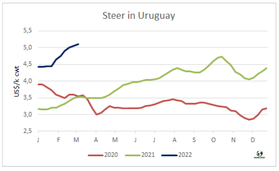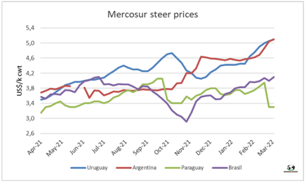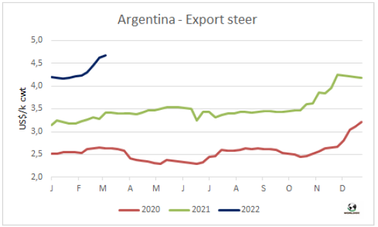 本周南方共同市場(chǎng)閹牛價(jià)格指數(shù)繼續(xù)8美分至4.36美元/公斤,創(chuàng)新紀(jì)錄。巴西烏拉圭阿根廷牛價(jià)均上漲,巴西育肥牛平均價(jià)格上漲主要原因是匯率走強(qiáng)和本地雷亞爾價(jià)格同步上漲,美金牛價(jià)較上周上漲了10美分至4.1美元/公斤。阿根廷和烏拉圭牛價(jià)達(dá)南美地區(qū)最高,也是歷史最高價(jià)格,本周出口閹牛參考價(jià)接近5.1美元/公斤,巴拉圭方面牛價(jià)趨勢(shì)相反,西方對(duì)俄羅斯的制裁限制了向這個(gè)國(guó)家銷(xiāo)售的可能性,巴拉圭受到了強(qiáng)烈的沖擊。