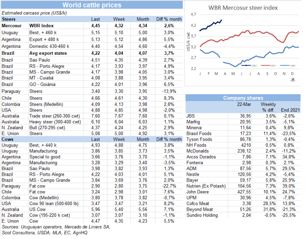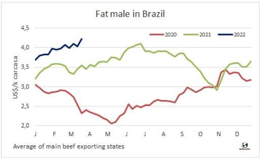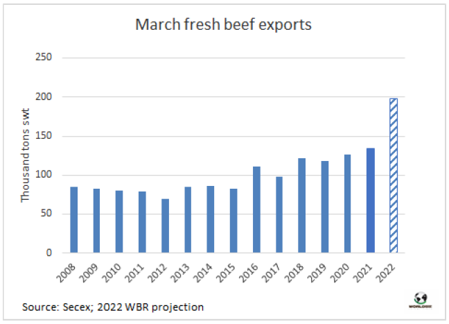 盡管上周牛肉出口速度有所下降,但3月有望成為歷史上巴西牛肉出口量最高的月份。如果在本月剩下的時(shí)間里保持這一勢(shì)頭,巴西的出口量將超過去年9月(18.7萬噸)的最大值,接近20萬噸。3月的前19天,巴西出口了121028噸牛肉,平均價(jià)格為5894美元/噸。這比2021年3月的出口量高出60%,而平均價(jià)格較上年增長(zhǎng)27.8%。