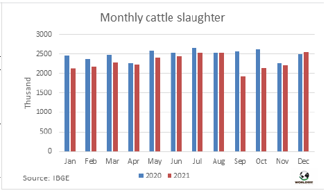 根據(jù)巴西地理和統(tǒng)計(jì)研究所(IBGE)的數(shù)據(jù),巴西活牛生產(chǎn)商2021年屠宰了2754萬頭牛,比前一年下降了7.8%。IBGE在一份報(bào)告中表示:“這一結(jié)果反映出牛屠宰量連續(xù)第二年下降,延續(xù)了自2020年初以來觀察到的保留存欄情況?!迸c去年同期相比,唯一一個(gè)屠宰量增加的月份是12月,增加了4萬頭,而降幅最大的是9月,減少了65.1萬頭,由于馬托格羅索州和米納斯吉拉斯州出現(xiàn)了非典型的瘋牛病病例,出口禁運(yùn)。犢牛平均價(jià)格創(chuàng)紀(jì)錄的上漲刺激了母牛的保留存欄。2021年全年母牛屠宰的量931萬頭,是自2004年以來的最低記錄?!?今的年牛屠宰數(shù)量較2020年減少了234萬頭,27個(gè)州中23個(gè)州屠宰量都有減少。馬托格羅索州屠宰量下降最為顯著,下降了633.91萬頭。南馬托格羅索州屠宰量減少了43.89萬頭。2021年馬托格羅索州仍以16.2%的占比保持屠宰量領(lǐng)先地位,其次是戈亞斯州(占比10.8%)和南馬托格羅索州(占比10.7%)。2021年第四季度,衛(wèi)生檢查機(jī)構(gòu)注冊(cè)下的屠宰廠屠宰量約690萬頭,較2020年第四季度下降了6.4%,達(dá)2008年以來最低。與2021年第三季度相比,屠宰量下降了0.9%。