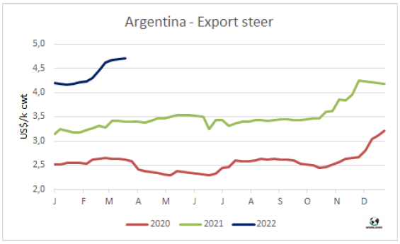 Ganadero信息中心主管、專家Ignacio Iriarte表示,阿根廷貧困人口的經(jīng)濟(jì)局限性和對(duì)牛肉出口的限制(匯率、出口稅、出口配額、向國(guó)內(nèi)市場(chǎng)提供補(bǔ)貼)未能阻止牛肉價(jià)格創(chuàng)1960年以來的最高記錄。在專家看來,盡管近幾個(gè)月來,活牛價(jià)格似乎已經(jīng)到了上限,“然后,供應(yīng)稀缺迫使出口商和消費(fèi)者支付更高的價(jià)格?!蹦壳盎钆9?yīng)不足,在很長(zhǎng)一段時(shí)間內(nèi)也不會(huì)有所改善,無法滿足肉類加工廠的產(chǎn)能或強(qiáng)烈的海外市場(chǎng)需求。他還記得“2月每天的屠宰量比去年同期下降了7%;希爾頓的閹牛報(bào)價(jià)很低,沒有足夠的工業(yè)母牛滿足中國(guó)的需求,而體重較輕的犢牛、小母牛、閹牛的供應(yīng)非常低,反映了飼養(yǎng)場(chǎng)的嚴(yán)重危機(jī)”。此外,他還稱,在未來幾個(gè)月活牛的短缺肯定會(huì)加劇。