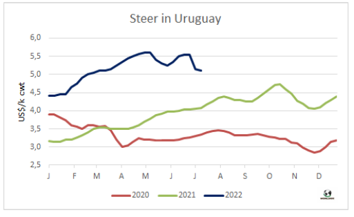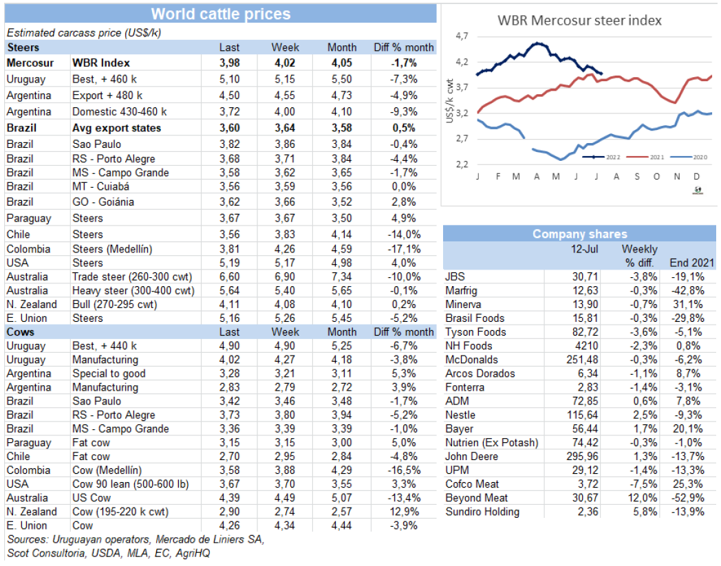 五家工廠暫停屠宰活動加上一些還在進行屠宰活動的工廠減產(chǎn),導(dǎo)致牛屠宰量下降至2020年末至今一年半以來的最低水平。烏拉圭肉協(xié)報告,截止7月9日,一周內(nèi)牛屠宰量29829頭,環(huán)比減少了1萬多頭,減幅約25%。同比減少了2.1萬頭,減少了42%。屠宰量較上周下降是由于閹牛屠宰量下降了約28%至14561頭,母牛屠宰量較上周下降了17%至10506頭。小母牛屠宰量下降了17%至4297頭。屠宰量最高的工廠是Las Piedras,379廠,屠宰量 5022頭, Marfrig-Cledinor,394廠,屠宰量 3180頭和Ontilcor 439廠,屠宰量3,041頭。美麗華三家屠宰場屠宰量累計6553頭,Marfrig兩家屠宰場累計屠宰量5735頭。本周烏拉圭2廠,104廠等一些上周暫停的屠宰場恢復(fù)屠宰, 12廠,344廠,310廠仍未恢復(fù)屠宰。美麗華7廠屠宰持續(xù)至昨天,將暫停屠宰直至八月中旬。本周屠宰量將繼續(xù)保持低水平,不過將較前一周的低點有所提高。
