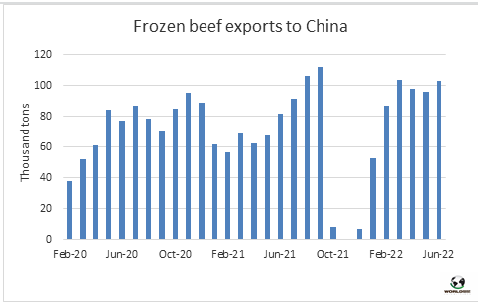 6月份,中國牛肉的主要供應(yīng)國發(fā)船量仍然很大。據(jù)估計,南方共同市場、澳洲和美國牛肉出口量達(dá)22.1萬噸,非常接近2021年9月22.4萬噸的最高峰值。據(jù)估計從南方共同市場發(fā)貨量約17萬噸,其中從巴西發(fā)貨量超過10.3萬噸。此外,從澳洲發(fā)貨量3.3萬噸,從美國發(fā)貨量1.8萬噸,與3-5月的出貨水平相當(dāng)。這些貨物量大多在7月下半月到8月之間抵達(dá)中國。