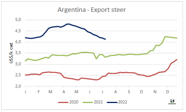 周二,受俄羅斯石油對歐盟國家斷供影響,歐元兌美元匯率跌至20年以來最低水平。投資者更青睞美元,自今年年初以來美元已經(jīng)上漲了近14%。阿根廷希爾頓臀腰肉價格受此影響下跌,過去一周內(nèi)下跌了500美元/噸。據(jù)市場參與者反映,13000美元/噸已經(jīng)是成交價的天花板了。有一位歐洲進口商還價13000-13500美元/噸,本周初其他進口商給新發(fā)船的阿根廷產(chǎn)品還價在12700-12800美元/噸。烏拉圭方面,受屠宰量急劇縮減的影響,供應(yīng)有限,參考價12500美元/噸。