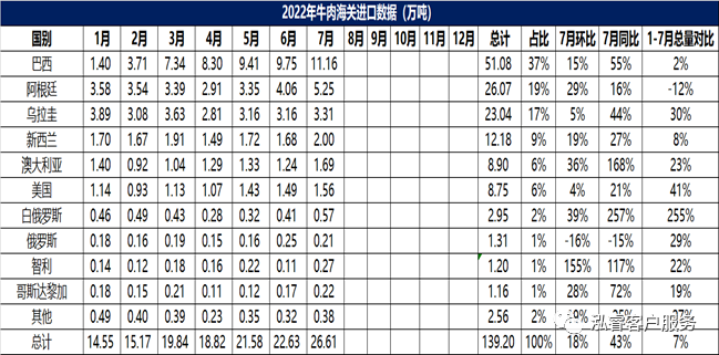 2022年7月中國(guó)主港牛肉進(jìn)口量26.61萬(wàn)噸,環(huán)比增長(zhǎng)18%,同比增長(zhǎng)43%。1-7月牛肉進(jìn)口量累計(jì)139.2萬(wàn)噸,同比增長(zhǎng)7%。前五大進(jìn)口來(lái)源國(guó)分別為巴西、阿根廷、烏拉圭、新西蘭、澳大利亞,美國(guó)位居第六位。從第一大進(jìn)口來(lái)源國(guó)巴西的進(jìn)口量占總進(jìn)口量的37%。