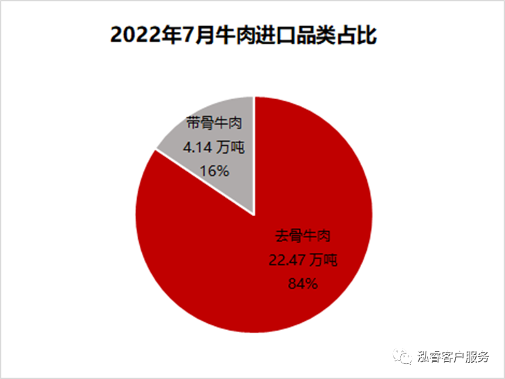 從牛肉進(jìn)口品項(xiàng)看,7月去骨牛肉進(jìn)口量22.47噸,占84%,帶骨牛肉進(jìn)口量4.14萬(wàn)噸,占16%。