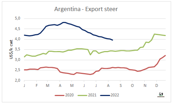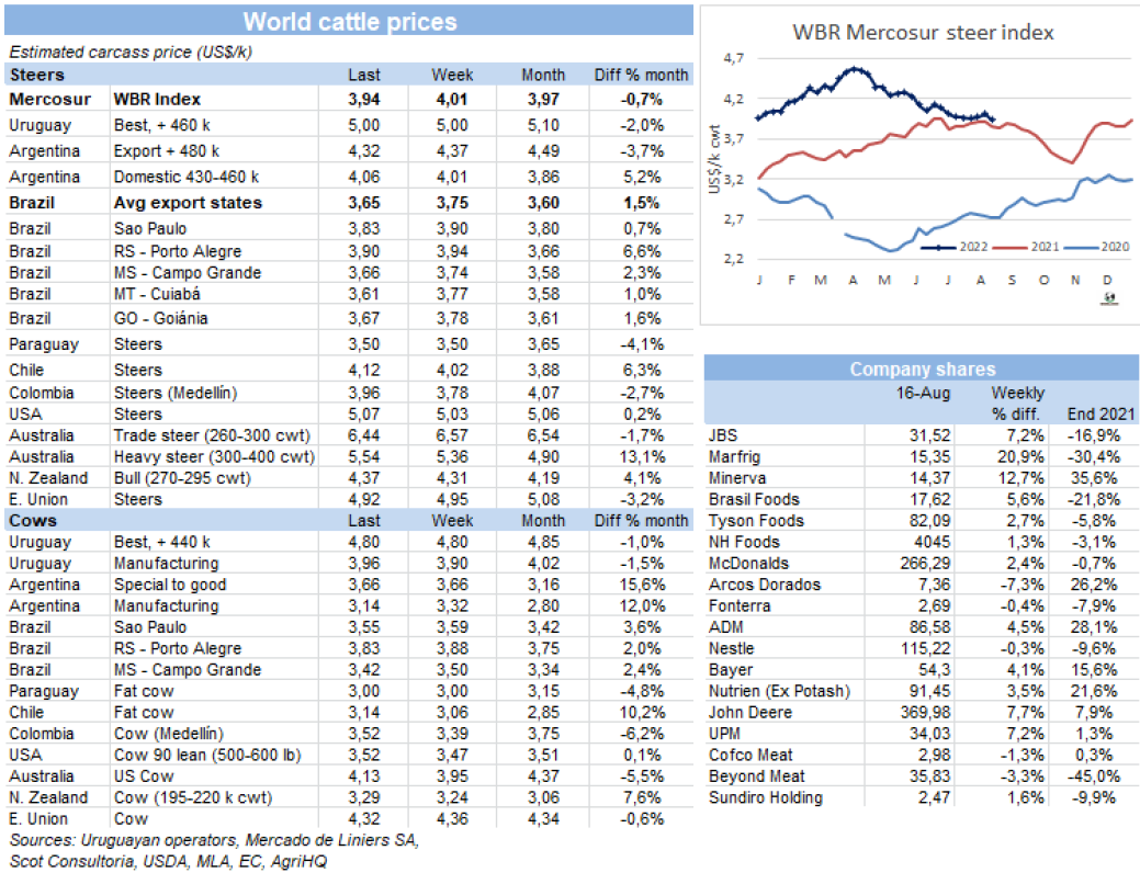根據(jù)馬托格羅索州農(nóng)業(yè)經(jīng)濟(jì)研究所的市場報告,馬托格羅索州7月的牛肉出口量達(dá)2022年第二大,胴體重量為46510噸。出口繼續(xù)受到中國需求旺盛的推動,中國需求持續(xù)高于3萬噸水平。另一個重要的一點(diǎn)是,英國進(jìn)口的參與度提高了,英國市場自脫歐以來持續(xù)擴(kuò)大。