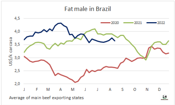 八月前十個工作日巴西出口量持續(xù)較大,出口價格下降。巴西外貿(mào)部報告前十個工作日巴西牛肉出口量達(dá)88806噸,平均出口價格6284美元/噸,平均出口價格較七月下降了4%,較六月的最高點(diǎn)下降了8%。如果保持前兩周的出口節(jié)奏,八月巴西牛肉出口量將達(dá)20萬噸,較2021年八月增加超2萬噸,也將創(chuàng)歷年八月出口量最高記錄。