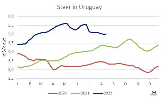 七月閹牛類型值連續(xù)兩周下跌,烏拉圭肉協(xié)報告每頭牛的閹牛類型值較上月下降了53美元,較五月的峰值下降了85美元。閹牛類型價值是烏拉圭肉協(xié)對一頭520公斤重,出成率54%的閹牛及其串種屠宰后產(chǎn)生所有產(chǎn)品的銷售價格的預(yù)估。烏拉圭肉協(xié)稱閹牛類型值下降是由于其組成成分的價格,其中下跌最明顯的是牛雜碎、牛副產(chǎn)品和鮮牛皮下跌最明顯。而屠宰場的活牛采購價格較上月僅下跌了2美分至1550美元,因此工業(yè)附加值縮減了51美金/頭至235美元,因此工廠要想盈利必須覆蓋其他成本。