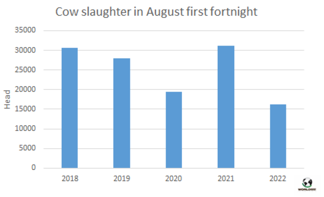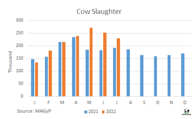7月牛肉產(chǎn)量26.1萬噸,同比下降1.6%。7月人均消費(fèi)量達(dá)45公斤/人/年,比一年前下降了5.4%。2022年到目前為止,由于平均屠宰重量的增加,牛肉產(chǎn)量已達(dá)180萬噸,比2021年同期增加了近4%。因此前7個月的人均消費(fèi)量為46公斤/人/年。
