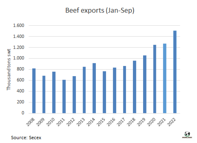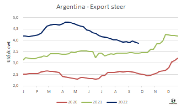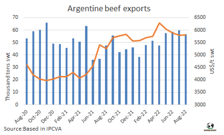 8月阿根廷對(duì)中國(guó)的出口大幅下降,為4.16萬(wàn)噸,其中8700噸是帶骨牛肉。冷凍去骨牛肉對(duì)中國(guó)出口量3.28萬(wàn)噸,環(huán)比下降20%。中國(guó)在阿根廷肉類(lèi)出口中的份額從上個(gè)月的82%下降到8月份的73%。阿根廷牛肉出口商會(huì)指出:“2022年8月出口到中國(guó)的去骨牛肉的平均價(jià)格略高于5500美元/噸,與去年5月的5900美元/噸的峰值相比有明顯下降”。