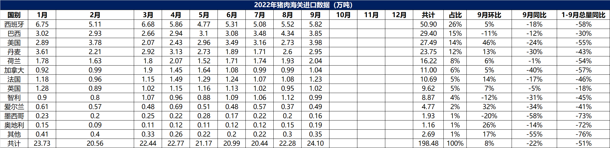 2022年9月中國主港豬肉進口量24.1萬噸,環(huán)比增加8%,同比減少22%。1-9月中國主港豬肉進口總量198.48萬噸,同比減少51%。從進口國別看,西班牙豬肉進口總量穩(wěn)居第一,占進口總量的26%。巴西、美國、丹麥豬肉進口量依次穩(wěn)居進口量前四。