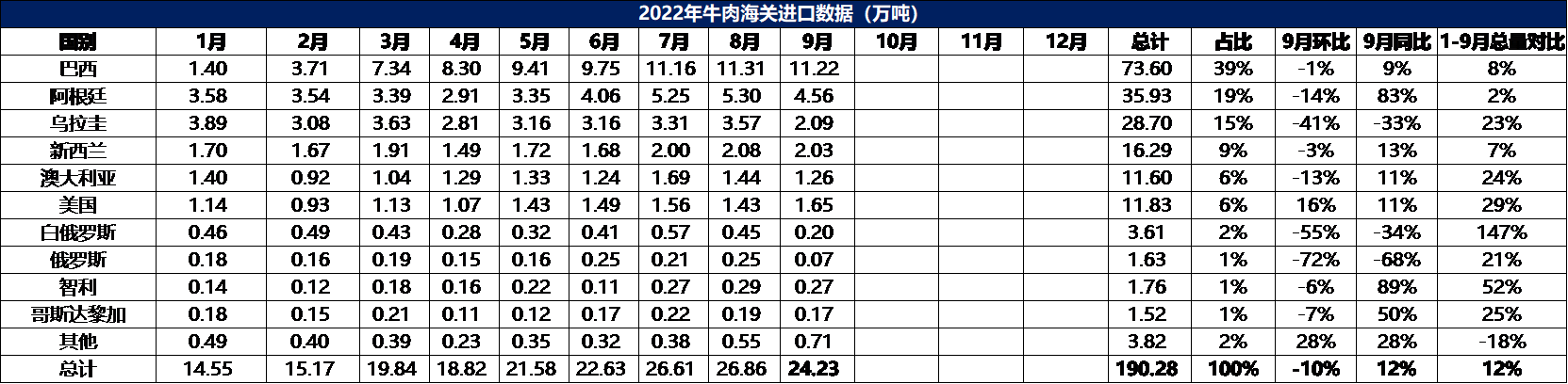 2022年9月中國主港牛肉進口量24.23萬噸,同比+12%,環(huán)比-10%;1-9月中國主港累計進口量190.28萬噸,同比+12%。從進口國別看,前五大進口來源國分別為巴西、阿根廷、烏拉圭、新西蘭、美國。9月從美國牛肉進口量11.83萬噸,超越澳大利亞(11.6萬噸)成為第五大進口來源國。