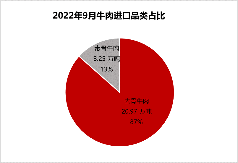 從進口品類看,帶骨牛肉進口量20.97萬噸,占87%,去骨牛肉進口量3.25萬噸,占13%。
