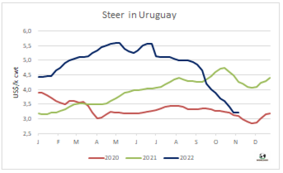 左派總統(tǒng)候選人Lula Da Silva在周日的選舉中獲勝,最初對巴西匯率產(chǎn)生了負面影響,之后雷亞爾升值,從而推高了南方共同市場牛價。本周南方共同市場閹牛價格指數(shù)上漲了2美分至3.28美元/公斤,打破了連續(xù)三周的下跌勢頭。本周巴西雷亞爾增值2.9%,中和了本地市場育肥牛價格的疲軟,美元價格上漲了4美分至3.27美元/公斤。阿根廷出口閹牛價格繼續(xù)下跌,本周下跌了2美分至3.65美元/公斤。烏拉圭和巴拉圭牛價保持穩(wěn)定,烏拉圭閹牛參考價3.2美元/公斤,巴拉圭參考價2.8美元/公斤。