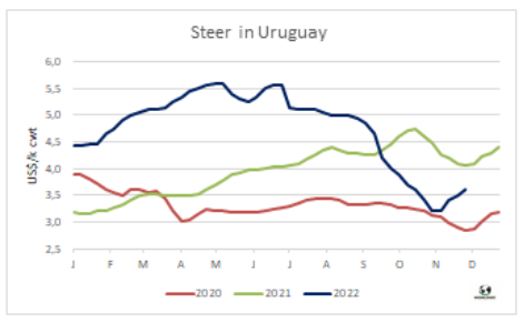 今年下半年,南美國家牛肉價格下跌,但谷物價格仍居高不下。這將導致南美國家減少育肥投入,從而導致2023年前幾個月育肥牛供應下降。烏拉圭集約化養(yǎng)殖者協(xié)會(Aupcin)主席álvaro Ferrés告訴WBR,“有些人開始擔心2023年第一季度供應減少。如果未來幾個月牛價上漲,育肥場的供應狀況可能會改善,”從成本方面來看,由于動物飼料價格仍維持在高位,且雨后預備牛價格穩(wěn)定,預計不會出現(xiàn)大幅下降??紤]到草飼牛的銷售旺盛,直到年中,以及由于缺水而導致的牧草狀況不佳,Ferrés認為“必須進行谷飼育肥才能得到成品牛?!蹦厦赖貐^(qū)其他國家情況也類似。巴西方面,根據(jù)Cepea的說法,“目前的情況不適合圍欄牧場育肥?!卑⒏⒎矫?,“飼料場的現(xiàn)狀很差,”阿根廷育肥場協(xié)會(CAF)主席Fernando Storni告訴WBR。巴拉圭方面,近幾個月來育肥牛價格的暴跌導致飼養(yǎng)場每頭牛虧損100至200美元,因為架子牛的采購價格非常高。作為全球牛肉的主要供應商,南方共同市場在2023年的頭幾個月可能會出現(xiàn)供應減少,特別是牛齡較小的育肥牛。這是一個很重要的信息,因為巴西只能向中國出口屠宰時牛齡小于30個月的牛肉。