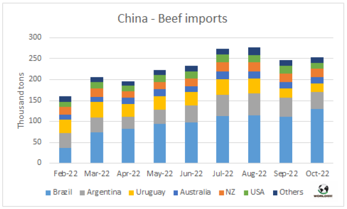 根據(jù)海關(guān)報告的數(shù)據(jù),中國10月進口牛肉253,717噸,略高于9月5000噸,盡管低于7月和8月進口量,7,8月進口量超過27萬噸。10月進口量中幾乎都是冷凍牛肉,冰鮮牛肉只有3902噸。在249,816噸冷凍牛肉中,30,689噸是帶骨牛肉,平均進口價格為3,291美元/噸,218,666噸是去骨牛肉,平均進口價格為6,884美元/噸。帶骨牛肉的主要供應國是烏拉圭,約9087噸,平均價格2982美元/噸。去骨冷凍牛肉的主要供應國是巴西,約130168噸,平均價格6,681美元/噸。此外,牛副到港量2392噸,烏拉圭也是主要供應國,從烏拉圭進口約781噸。盡管從澳洲出口量減少,考慮到9月和10月從南方共同市場發(fā)貨的數(shù)量,預期11月的牛肉進口量仍然很大, 11月進口量可能略低于10月。