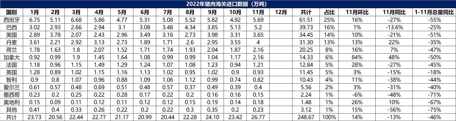 2022年11月中國(guó)主港豬肉進(jìn)口量26.77萬(wàn)噸,環(huán)比增加14%,同比減少13%。1-11月中國(guó)主港豬肉進(jìn)口量共計(jì)248.67萬(wàn)噸,同比減少46%。