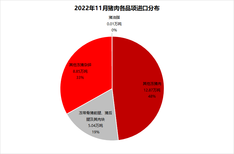 從進(jìn)口品項(xiàng)看,11月,其他凍豬肉進(jìn)口量12.87萬(wàn)噸,占比48%;其他凍豬雜碎進(jìn)口量8.85萬(wàn)噸,占比33%。豬主塊肉和豬油脂進(jìn)口量共計(jì)5.05萬(wàn)噸,占比19%。