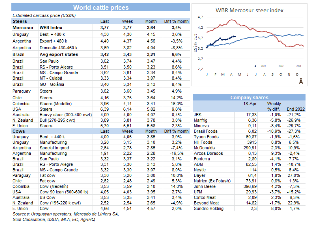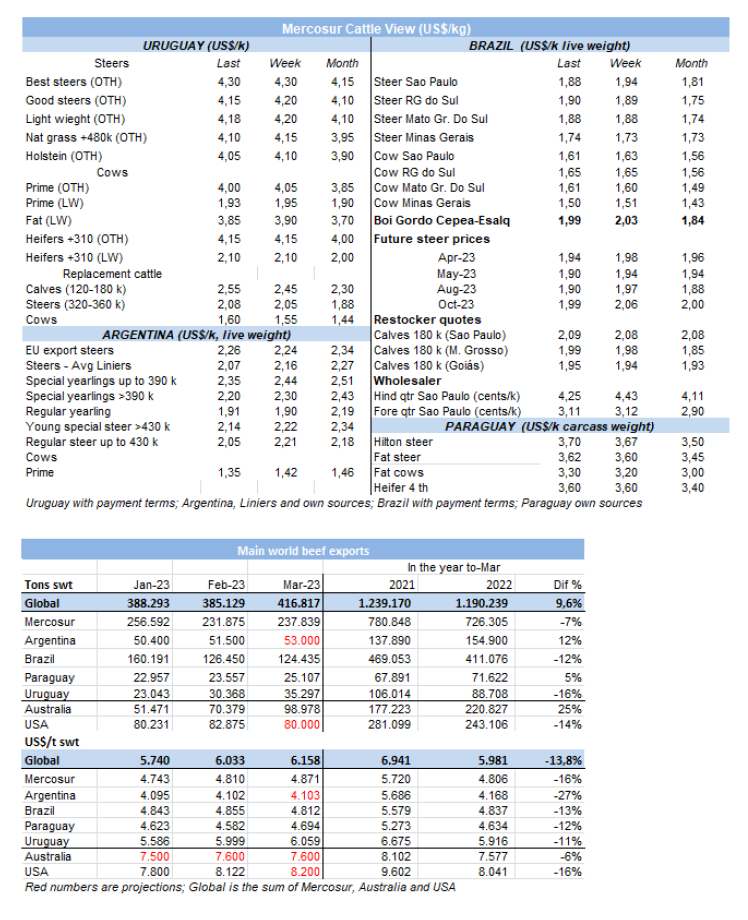 根據(jù)兩家進(jìn)口商的意見,逾越節(jié)假期后該地區(qū)新的猶太屠宰期的前景仍然“不是很明確”。第一批人員計(jì)劃在本月底左右抵達(dá)該地區(qū)。就阿根廷而言,這個(gè)想法是從“開放價(jià)格”開始的,就像在其他場(chǎng)合所做的那樣。在烏拉圭,由于用于猶太屠宰的成品牛供應(yīng)不足,所以并沒有明確的供應(yīng)情況可以告知。而巴西和巴拉圭地區(qū)的成品牛需求價(jià)在$6500-$7000之間。