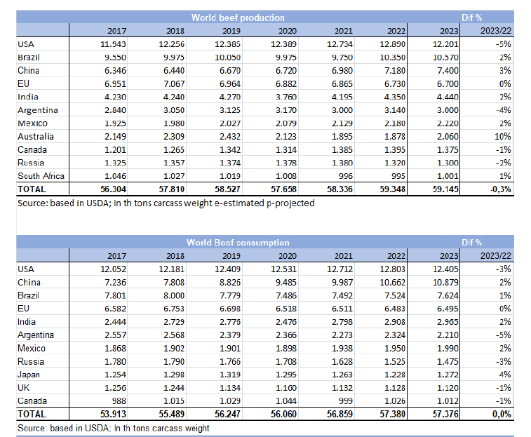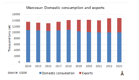 根據(jù)美國(guó)農(nóng)業(yè)部上周發(fā)布的預(yù)測(cè),主要的牛肉出口商會(huì)保持其對(duì)國(guó)際市場(chǎng)的穩(wěn)定銷售量,一些國(guó)家的銷售量減少將被其他國(guó)家的增長(zhǎng)銷量所抵消。三個(gè)主要出口國(guó)巴西、澳大利亞和印度將增加銷量,而其他國(guó)家(美國(guó)、阿根廷、烏拉圭、巴拉圭和新西蘭)將減少銷量,因此最終平均下來銷量與2022年非常相似。南方共同市場(chǎng)、大洋洲、北美和印度的總銷量約為1070萬噸,比去年增加6.7萬噸。