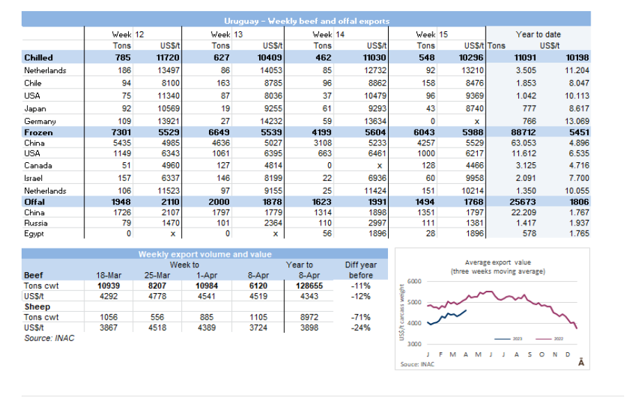 無論如何,價(jià)格沒有產(chǎn)生太大變化。前后腱$6800,板腱$5100,肋骨$5800,后部位肉$6000,80碎肉$3600。這些參考價(jià)格比3月底市場(chǎng)上的價(jià)格低約$100。一位實(shí)業(yè)家透露,鑒于最近幾周屠宰牛價(jià)格的上漲,他收到了中國(guó)出價(jià)$4000美金來收購(gòu)一頭母牛四分體,并表示“這個(gè)價(jià)格讓人無法接受”。