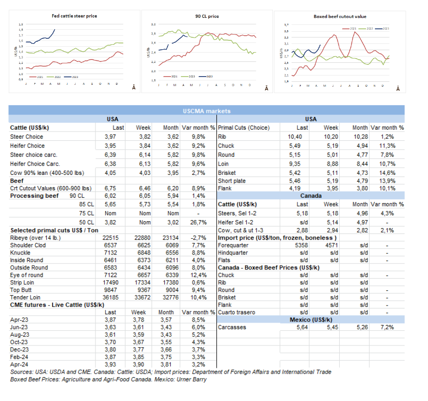 對(duì)犢牛季節(jié)的預(yù)期也有助于圍欄內(nèi)動(dòng)物數(shù)量的增加;今年第一季度有116萬頭牛進(jìn)入圍欄。因此,在 1月份下降 2% 之后,飼養(yǎng)場(chǎng)的牛在2月份增長(zhǎng)了3%,在3月份增長(zhǎng)了11%。報(bào)告稱:“截至2023年3月31日,牛存欄量比去年同期高出16%。