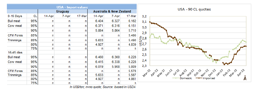 隨著美國(guó)牛和牛肉價(jià)格的堅(jiān)挺,進(jìn)口市場(chǎng)活躍。一家出口商用說美國(guó)從巴西進(jìn)口90CL碎肉價(jià)格是$4300-$4400,95CL碎肉價(jià)格是$4500-$4600。