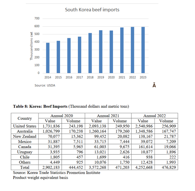 美國(guó)農(nóng)業(yè)部預(yù)計(jì)韓國(guó)2023年的牛肉進(jìn)口量為59.5萬噸,與2022年持平,比1月份的預(yù)測(cè)量低1.5萬噸。國(guó)內(nèi)供應(yīng)將增加近40噸達(dá)到37.9萬噸。