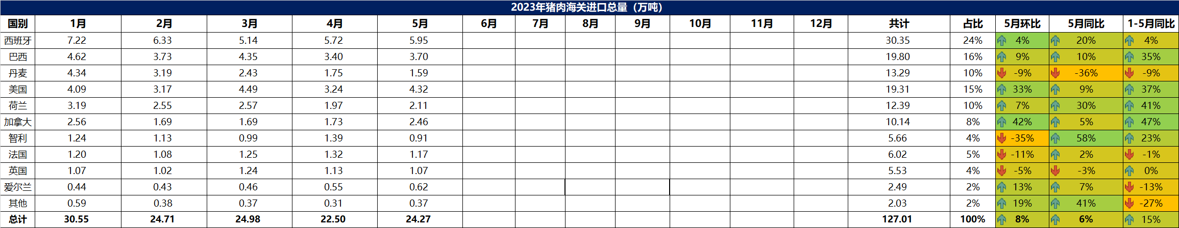 2023年5月中國主港豬肉進(jìn)口量24.27萬噸,環(huán)比增加8%,同比增加6%。1-5月主港豬肉進(jìn)口總量127.01萬噸,同比增加15%。從進(jìn)口國別看,5月豬肉進(jìn)口主要國別依然是西班牙、巴西、美國、丹麥和荷蘭,進(jìn)口量之和占比超過70%。