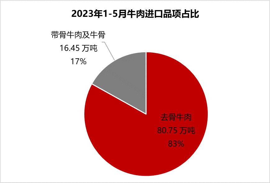 從進(jìn)口品項看,去骨牛肉進(jìn)口量80.75萬噸,占比83%,帶骨牛肉及牛骨進(jìn)口量16.45萬噸,占比17%。