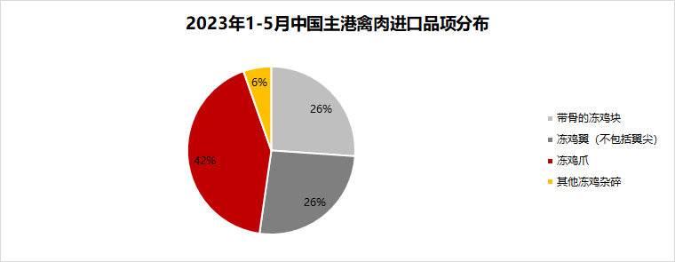 從進(jìn)口品項看,凍雞爪、帶骨的凍雞塊、凍雞翼(不包括翼尖)為主要進(jìn)口品類。其中1-5月凍雞爪進(jìn)口量23.8萬噸,凍雞翼(不包括翼尖)進(jìn)口量14.70萬噸,帶骨的凍雞塊進(jìn)口量14.66萬噸,其他凍雞雜碎進(jìn)口量3.02萬噸。