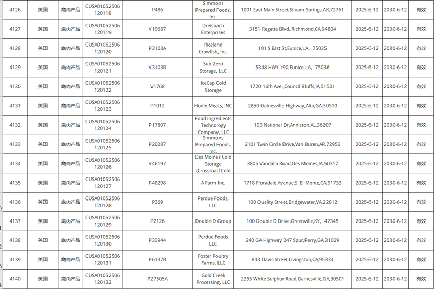 新增美國豬肉、禽肉企業(yè)自2025年6月12日及之后生產(chǎn)的符合中國要求的肉類產(chǎn)品輸華。其中83家禽肉企業(yè),23家豬肉企業(yè)。